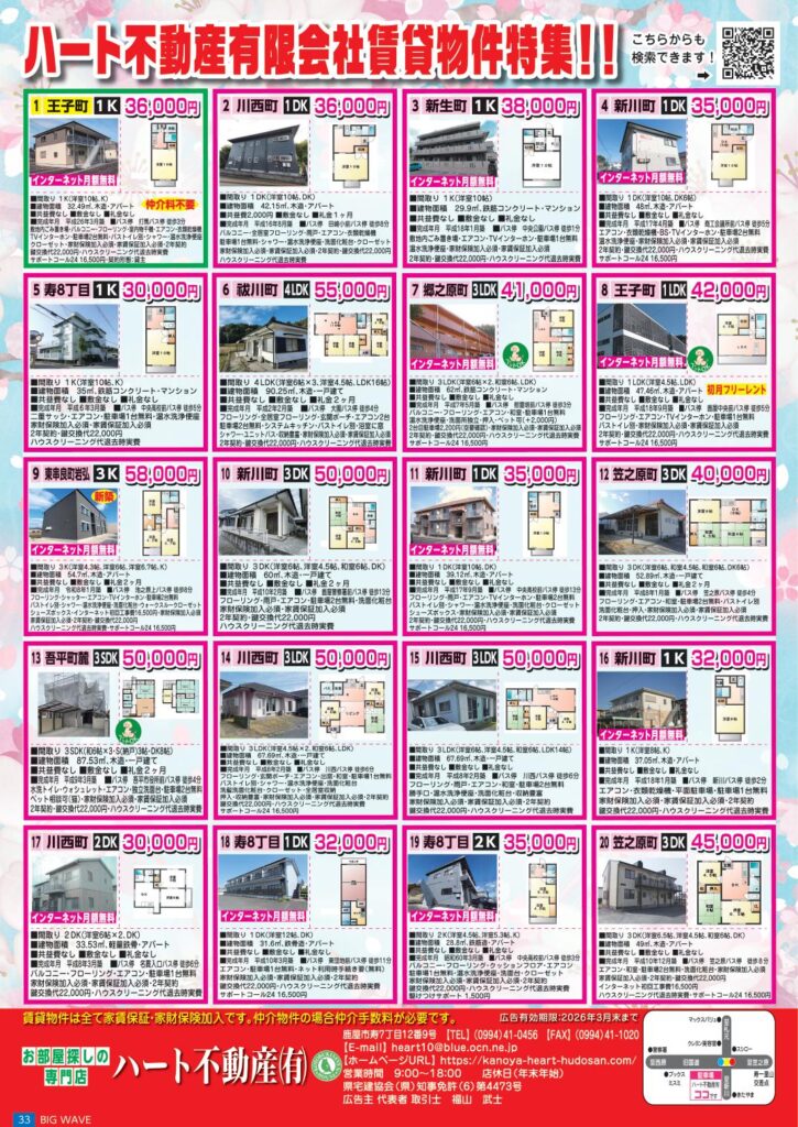 お世話になっておりますハート不動産です。 今月も『大隅のライフサポートマガジンBIGWAVE様』に3月の賃貸おすすめ物件を掲載しています。 掲載している物件はほんの一部になり、賃貸のほうはSuumo,いいへやねっと、店舗 […]